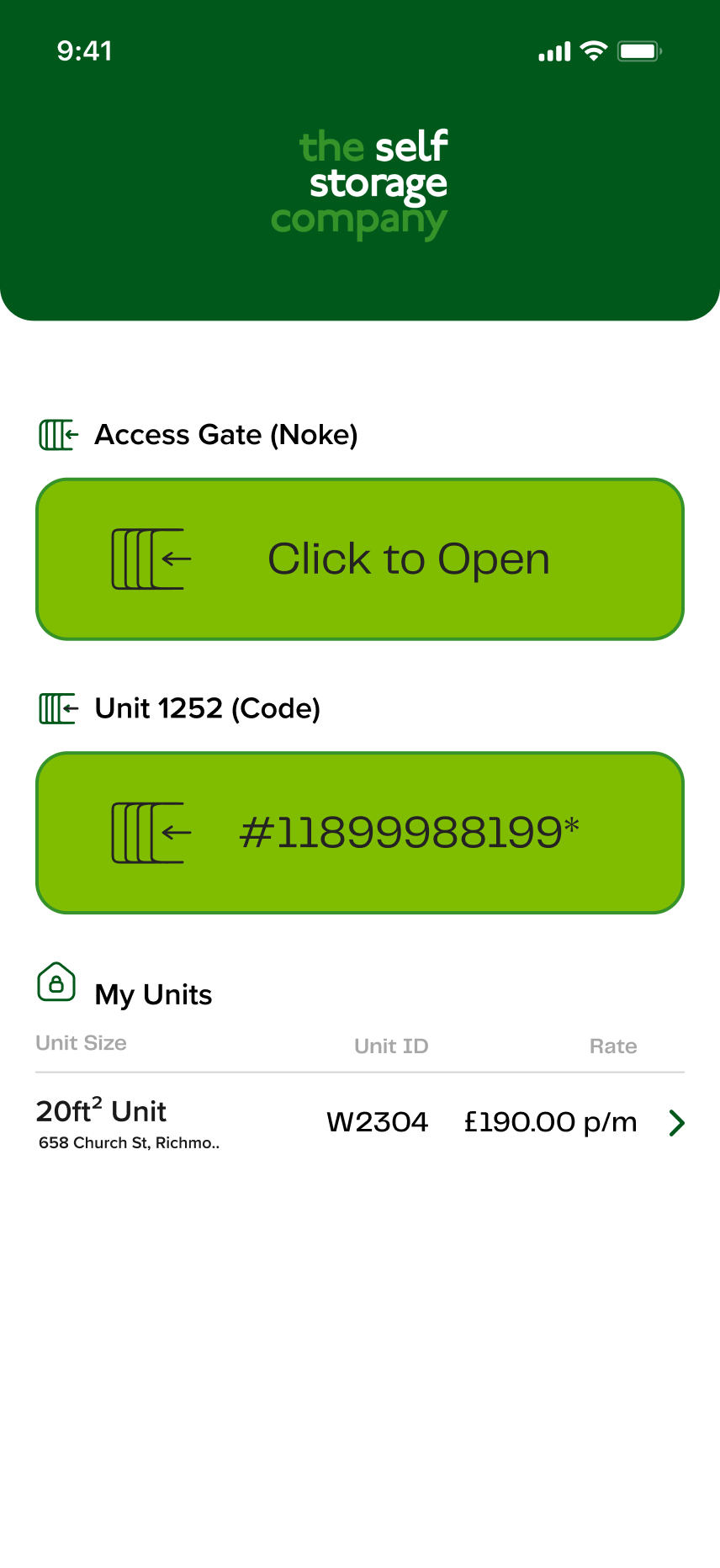 The Self Storage Company customers can access their account via our App. Our The Self Storage Company App makes it easy for you to check your account, view receipts and invoices, make payments anywhere, anytime. Once you have successfully verified your ID the app will grant you access to your unit giving your you unique access code.
